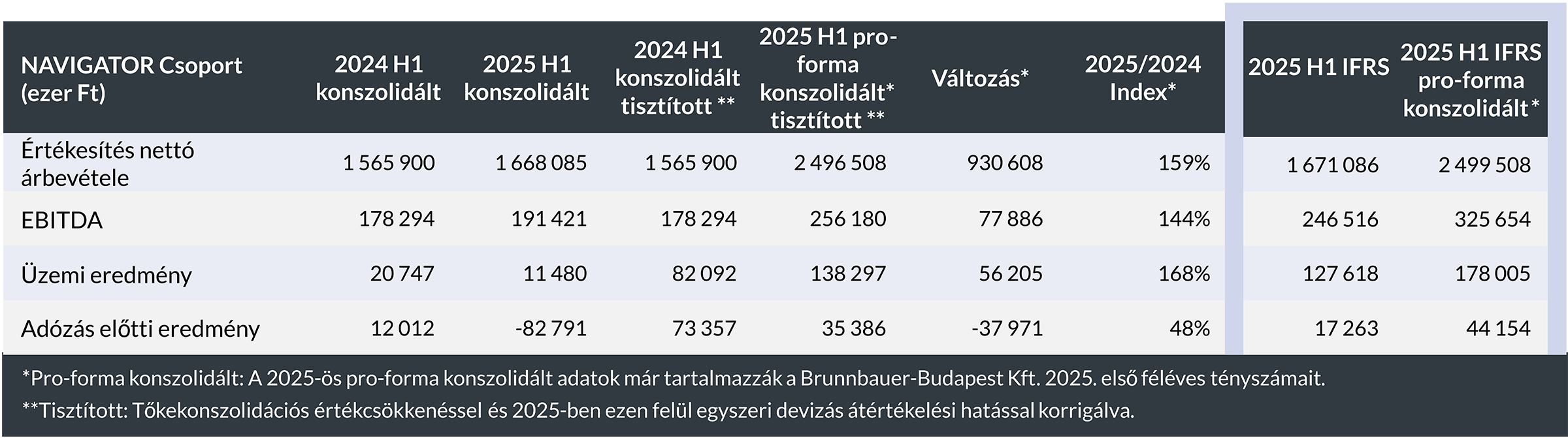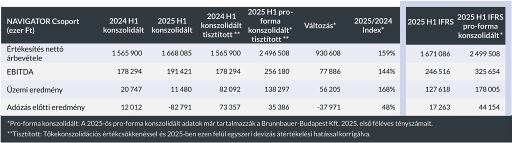 A NAVIGATOR Investments Nyrt. közzétette 2025 első féléves jelentését. A cégcsoport teljesítményét jelentősen javította a Brunnbauer-Budapest Kft. akvizíciója, amelynek eredményeként pro-forma szinten látványos bővülést értek el.